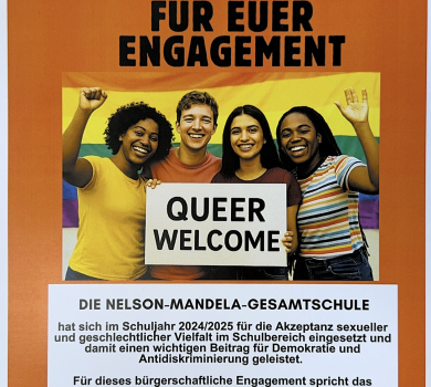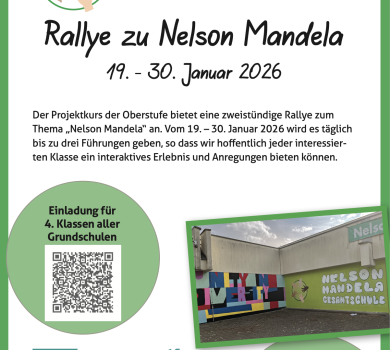 Willkommen an der Nelson- Mandela- Gesamtschule in Bergisch Gladbach. Sie wurde im Sommer 2013 im Schulzentrum am Ahornweg gegründet und in den Folgejahren als vierzügige Gesamtschule kontinuierlich aufgebaut. Der Name Nelson Mandela wurde in Erinnerung an den im Jahr 2013 verstorbenen südafrikanischen Freiheitskämpfer von der Schulkonferenz für unsere Schule vorgeschlagen und im Frühjahr 2014 vom Rat der Stadt Bergisch Gladbach beschlossen.