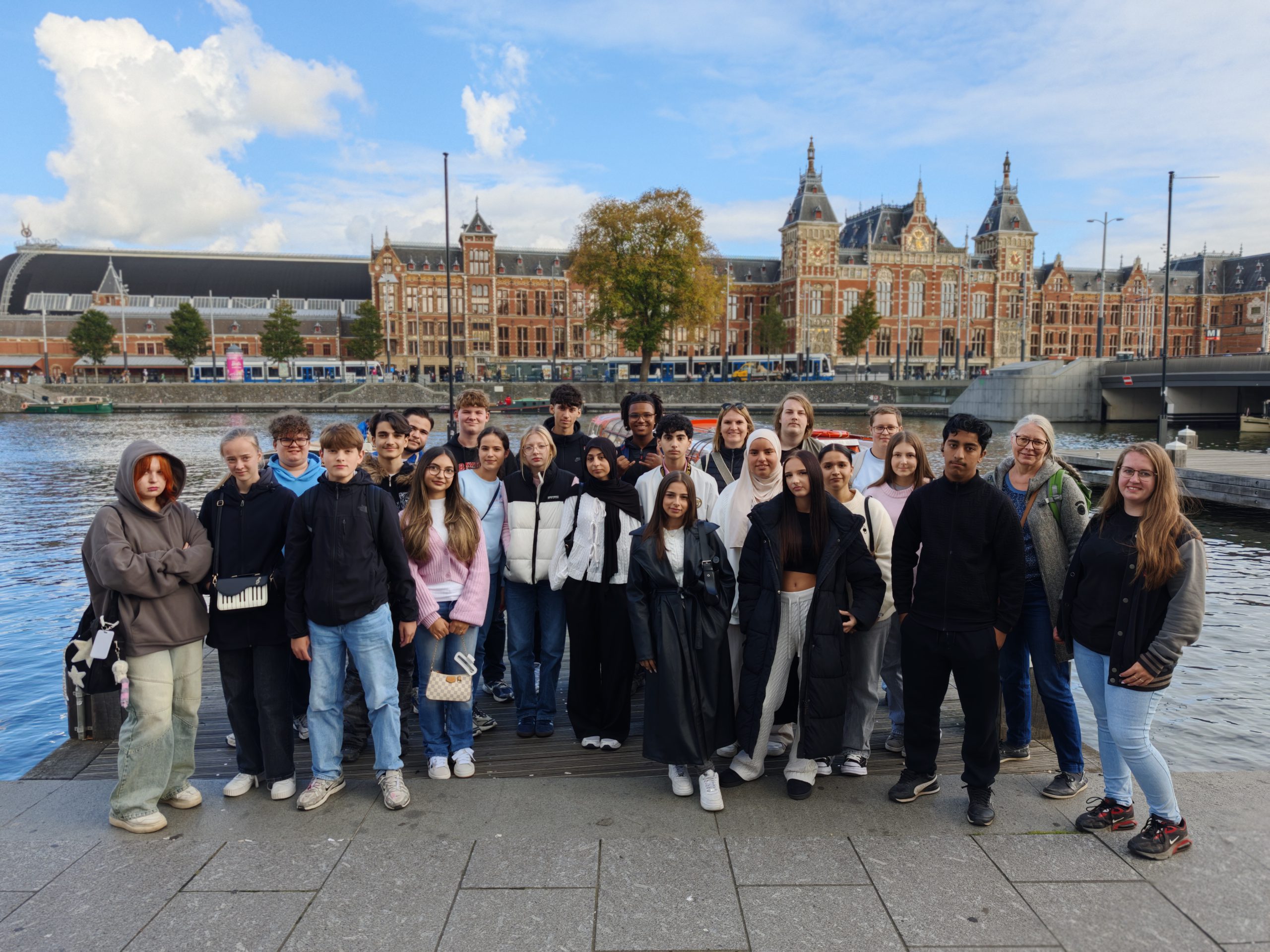 Vom 22.-26.9. hieß es für die Klassen 10 a, b und c “Koffer packen und ab nach Amsterdam”, denn unsere Abschlussfahrt stand an. Die Vorfreude war groß: Wir machten uns montags morgens mit einem Doppeldeckerbus von der Schule auf den Weg nach Amstelveen, ca. 30 Minuten südlich von Amsterdam, denn dort lag unser Bungalowpark, in dem wir in der Woche untergebracht waren. Wir wohnten in 6er-Bungalows und bezogen nach der Ankunft zunächst unsere Häuser bzw. machten uns auf den Weg zum Supermarkt, um uns für die Woche mit Lebensmitteln einzudecken. Die Bungalows waren zwar recht einfach, aber wir machten es uns in den nächsten Tagen dort trotzdem gemütlich.