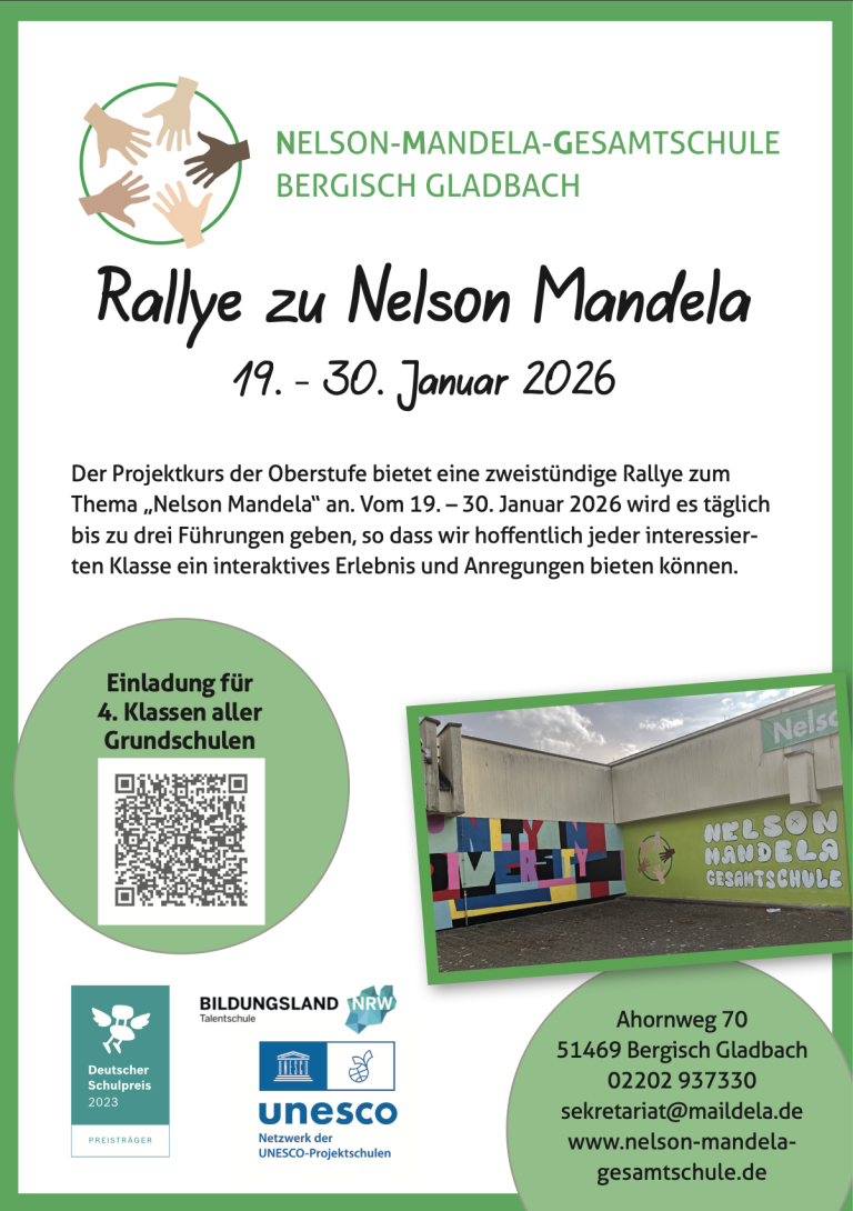 Der Projektkurs der Oberstufe bietet eine zweistündige Rallye zum Thema “Nelson Mandela” an. Vom 19. – 30. Januar 2026 wird es täglich bis zu drei Führungen geben, so dass wir hoffentlich jeder interessierten Klasse ein interaktives Erlebnis und Anregungen bieten können.