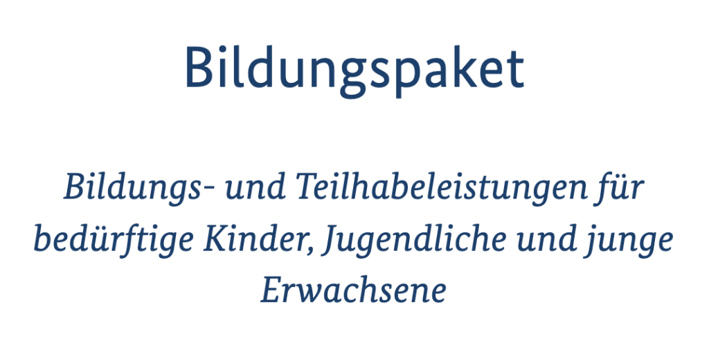 Das Bildungspaket der Bundesregierung ermöglicht Kindern und Jugendlichen die Teilhabe am sozialen und kulturellen Leben, wenn die eigenen finanziellen Mittel nicht ausreichen. Anspruchsberechtigt sind Personen, die Sozialhilfe, Wohngeld, Kinderzuschlag, Leistungen nach dem AsylbLG oder Arbeitslosengeld II beziehen. Das ist drin im Bildungspaket für Schüler*innen: Mittagessen in der Schule, Lernförderung, Kultur, Sport und Freizeit (Vereine), Tagesausflüge und Klassenfahrten, Schulbedarf und Schülerbeförderung.