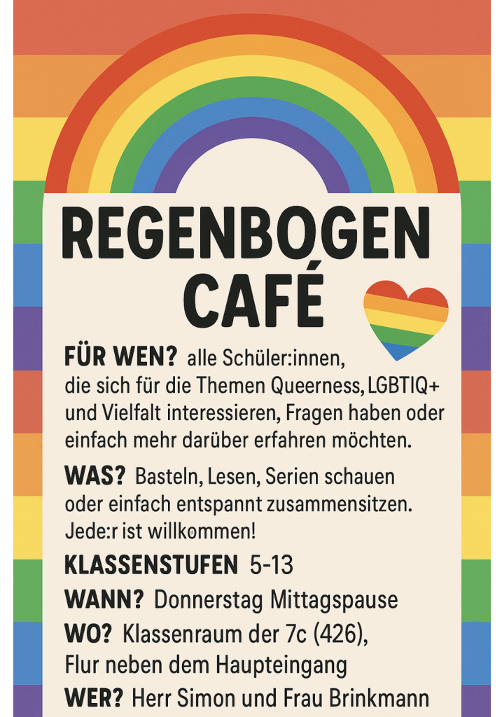 Im Regenbogen-Café wird geredet, gelacht, gespielt und diskutiert – über Themen rund um Vielfalt, Freundschaft, Gleichberechtigung und das, was Schüler*innen bewegt. Es ist ein Raum, in dem Offenheit, gegenseitiger Respekt und Gemeinschaft im Mittelpunkt stehen.
